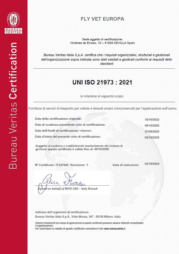 FlyVet è abilitata ai servizi di trasporto per cellule e tessuti umani crioconservati per l’applicazione sull’uomo secondo la norma UNI ISO 21973:2021